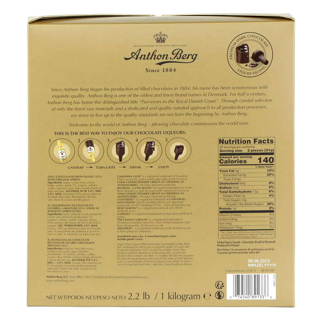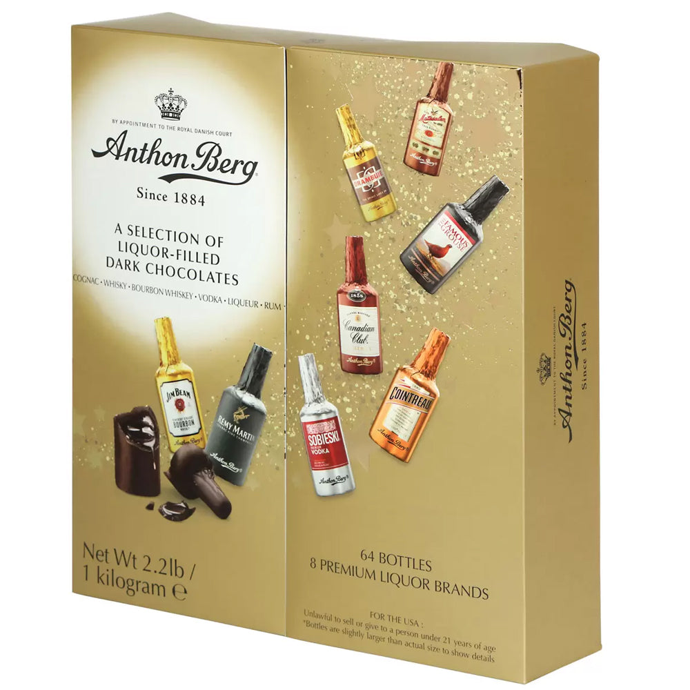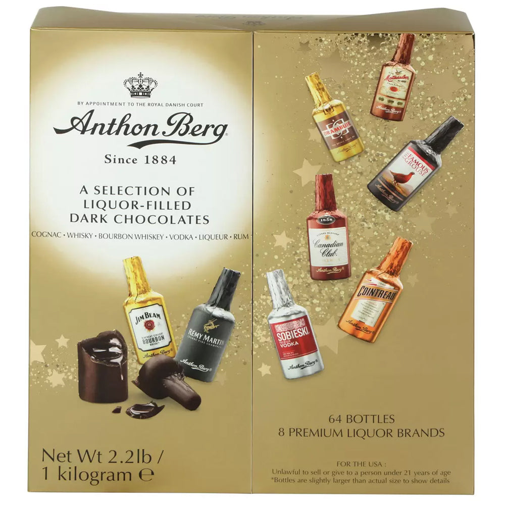 Indulge in the luxurious taste of Anthon Berg Chocolate Liqueurs, where premium chocolate meets exquisite spirits. This 1kg box contains 64 beautifully crafted bottle-shaped chocolates, each filled with authentic liqueur and coated in rich, smooth dark chocolate for a truly indulgent experience.
