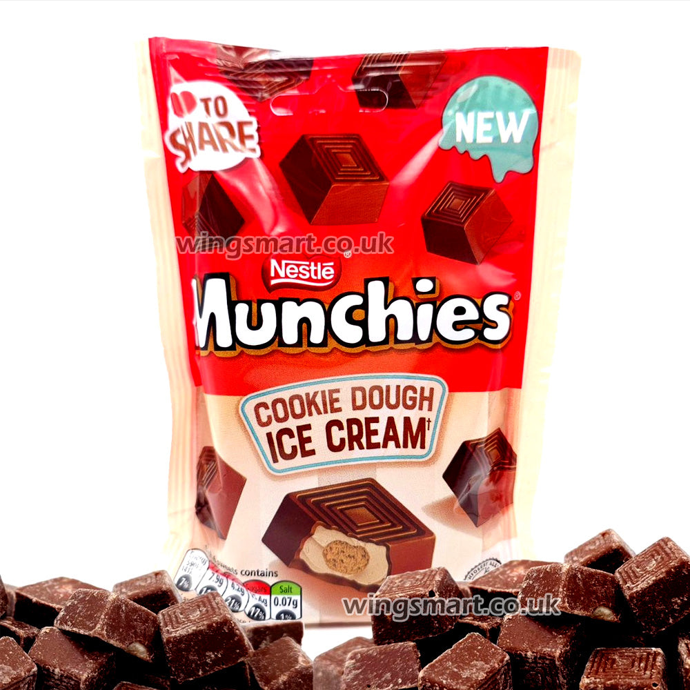 Discover the new MUNCHIES® Cookie Dough Ice Cream sharing bag, smooth milk chocolate cubes encasing a delicious cookie dough flavour filling & crunchy biscuit centre, making them the ideal treat to share with family and friends.
