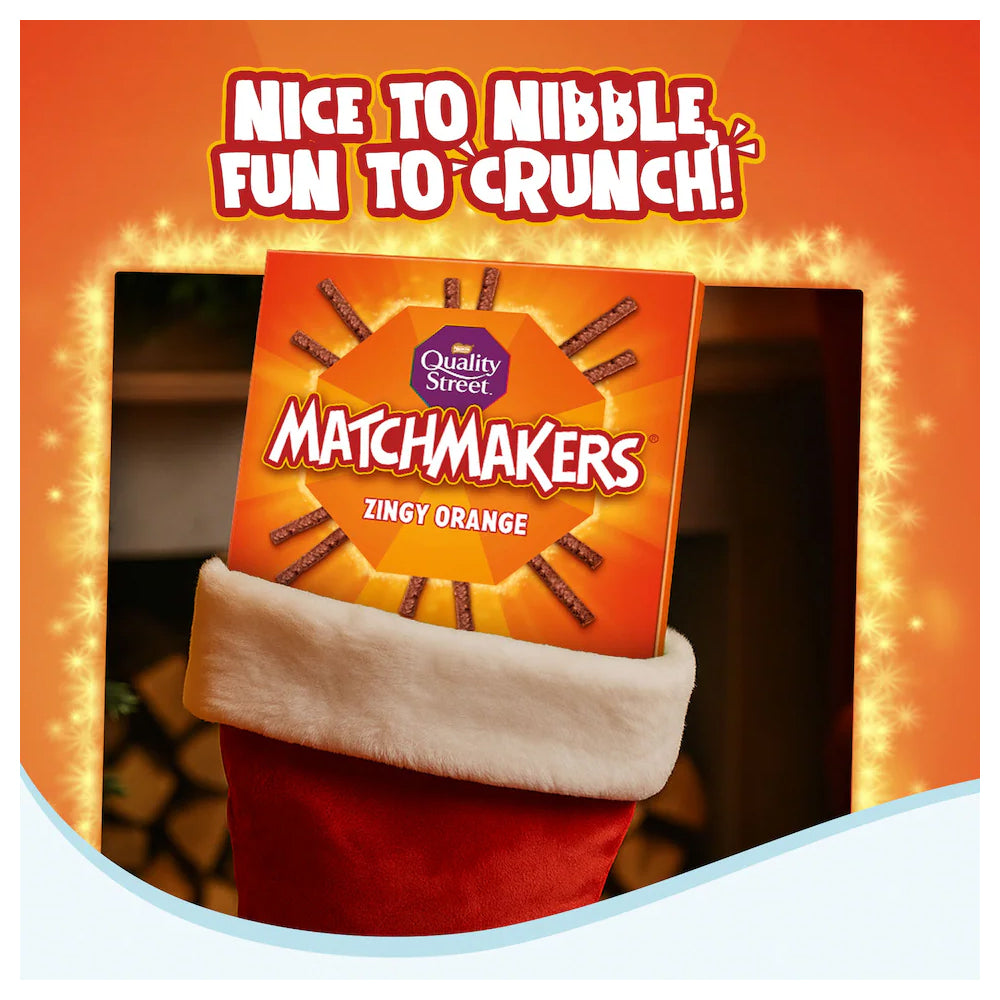 Enjoy the irresistible taste of Quality Street Matchmakers Zingy Orange, featuring crisp chocolate batons infused with a vibrant orange flavour. These slender, snappable chocolates deliver the perfect balance of smooth milk chocolate and refreshing citrus zing.