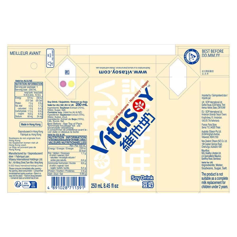 Enjoy the smooth and refreshing taste of Vitasoy Soy Drink, a plant-based beverage made from high-quality non-GMO soybeans. Naturally cholesterol-free and dairy-free, it’s a nutritious choice that provides a good source of protein while being gentle on the stomach. Perfect for those who are lactose intolerant or seeking a healthier alternative to regular milk.